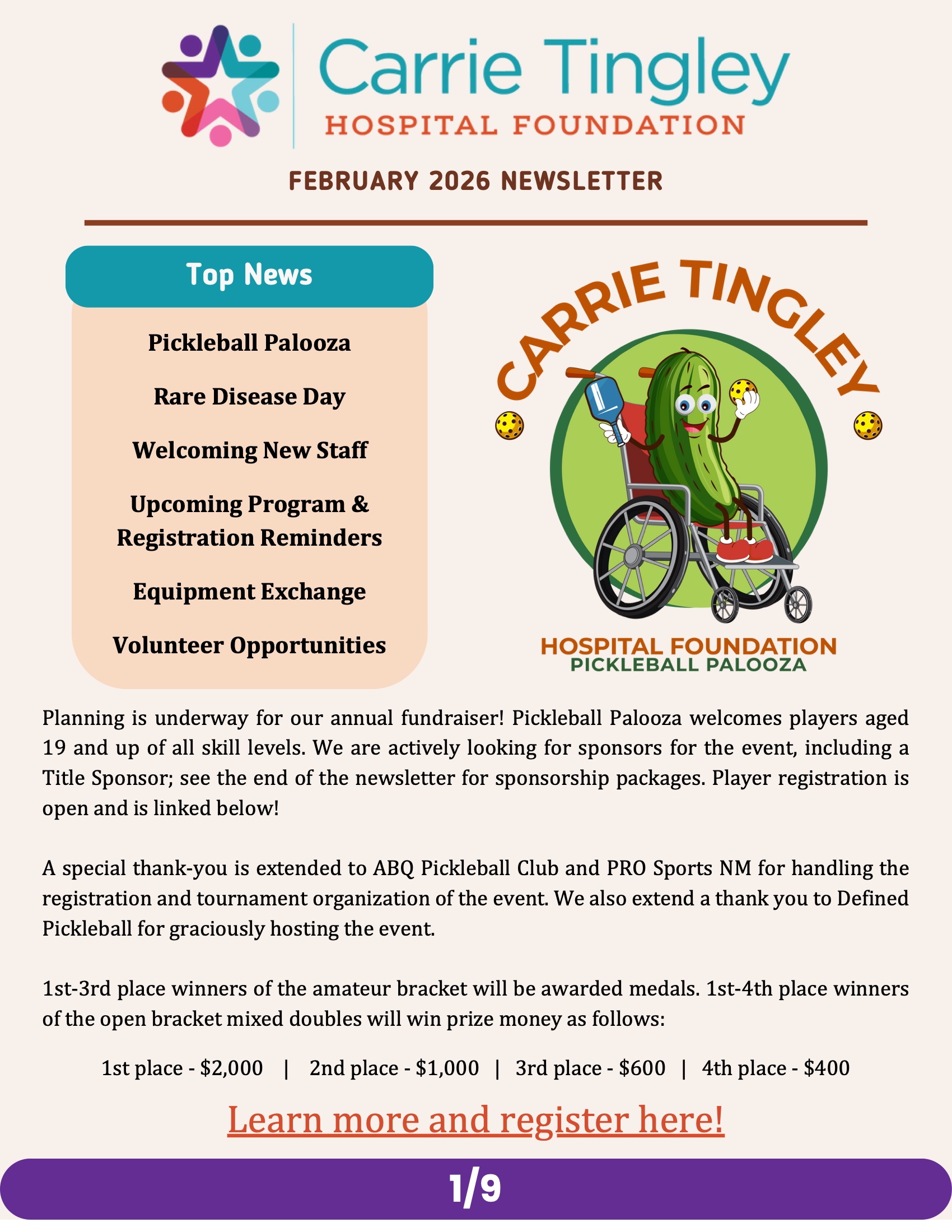 The Carrie Tingley Hospital Foundation is dedicated to enhancing the well-being of pediatric patients and their families by offering innovative programs and financial assistance that empower children with physical disabilities to pursue their dreams and reach their full potential. Through initiatives that promote inclusion, independence, and personal growth, we strive to ensure that every child has the opportunity to thrive. In support of this mission, the Foundation also provides financial assistance to the UNM Carrie Tingley Hospital for infrastructure improvements, research advancements, and the acquisition of specialized medical equipment.
